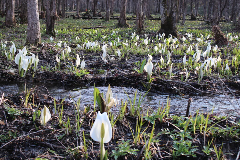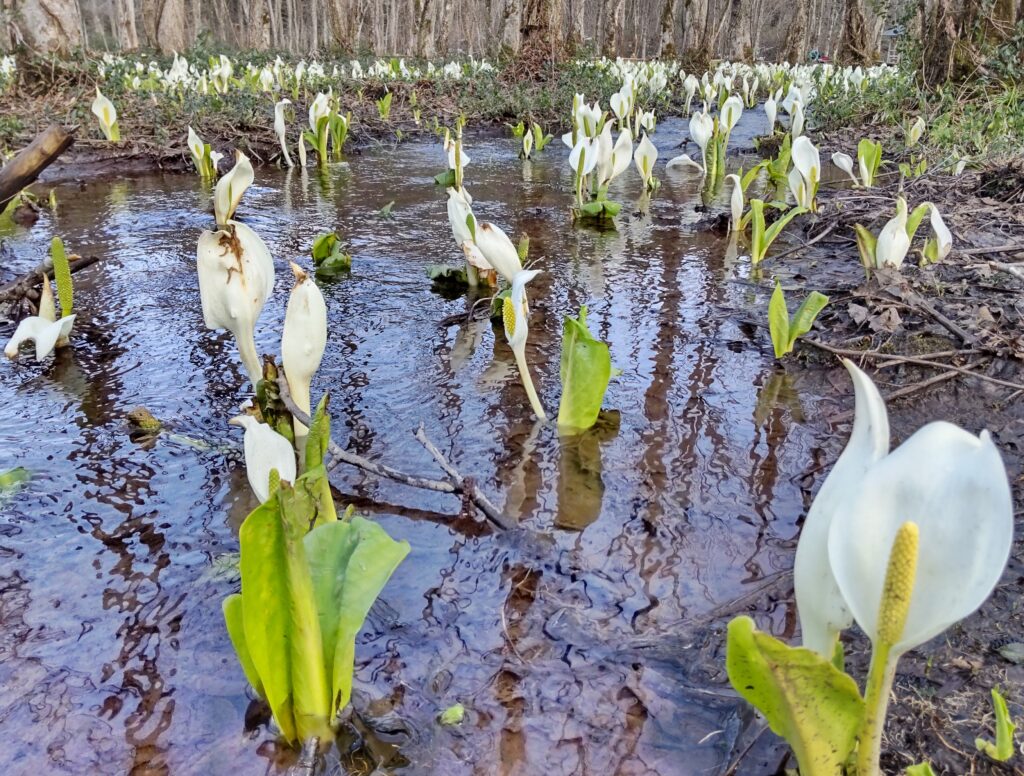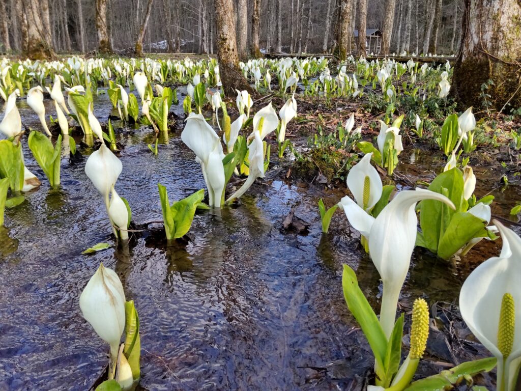 刺巻湿原のミズバショウ、早春を告げる清楚な白い花