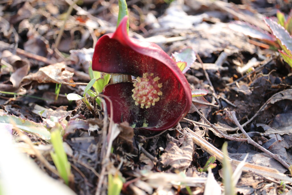所々に、このザゼンソウが咲いています。座禅をしているお坊さんの後ろを包み込んでいるから付いた名前なのでしょうか。