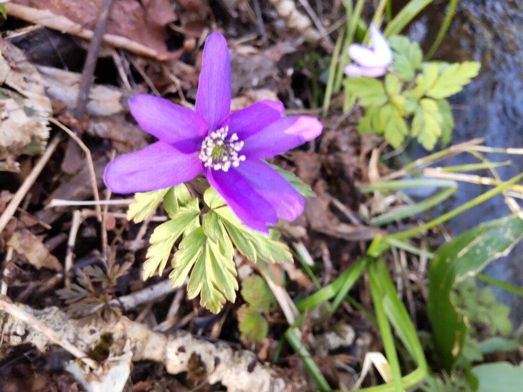 この刺巻湿原は、広いハンノキ林に囲まれています。ハンノキ林全体では約10ヘクタールほどありますが、そのうち約3ヘクタールが湿原になっていて、清楚な水が流れています。そんな中に、紫や白のキクザキイチゲが見つかります。