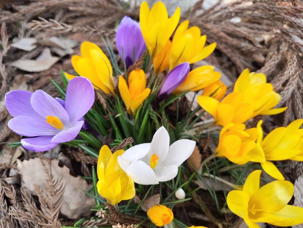 黄色、白、薄紫のすべての色が同時に咲いていて、きれいです。